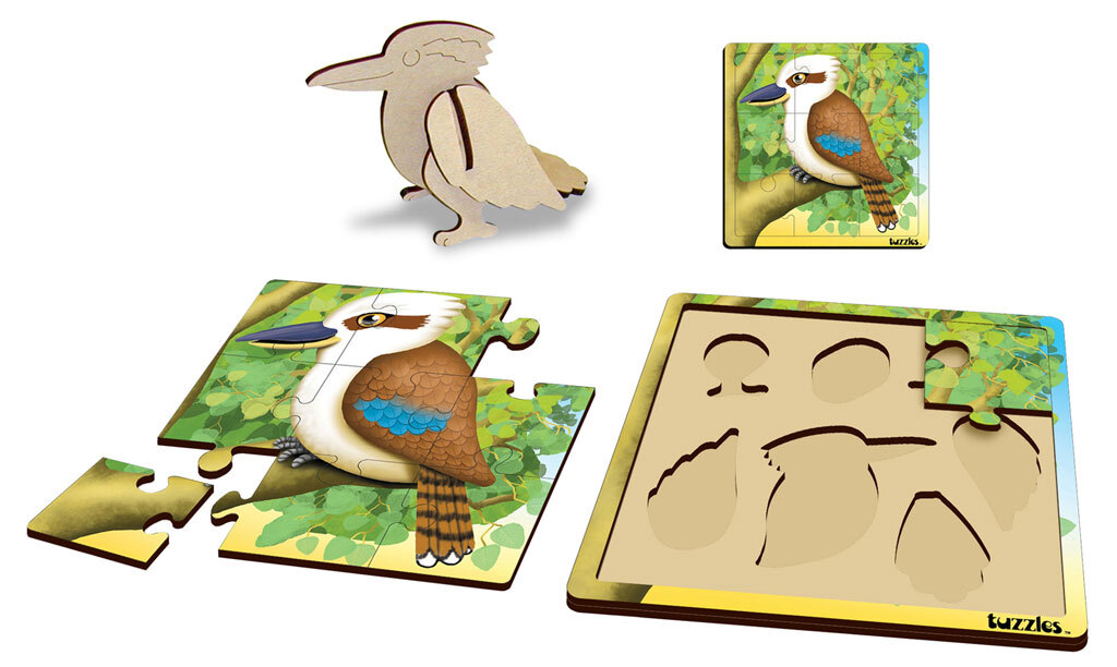 A 2 layer puzzle with the bottom layer pieces coming out to be built into a 3 D Kookaburra. The top layer is a traditionally cut jigsaw depicting a Kookaburra sitting on a tree branch. The Kookaburra is an Australian bird with a very distinctive laughing call. This puzzle is a great way for children to understand dimensions whilst learning in an interesting way.