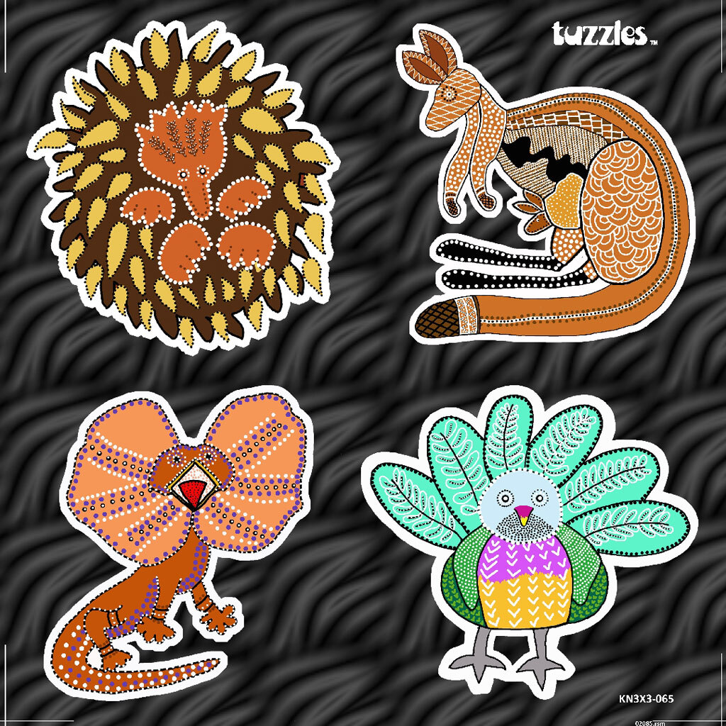 This Aboriginal Art Single Piece Peg Puzzle has four distinctly shaped pieces. The easy grip pegs help small hands to manipulate the pieces into their locations. The art work has been done by an Aboriginal artist and the bright and colourful images depict the Echidna, Kangaroo with Joey, Frilled Neck Lizard and the Wompoo Pidgeon. Puzzles develop fine motor, numbering, categorising and sorting skills whilst playing and having fun.