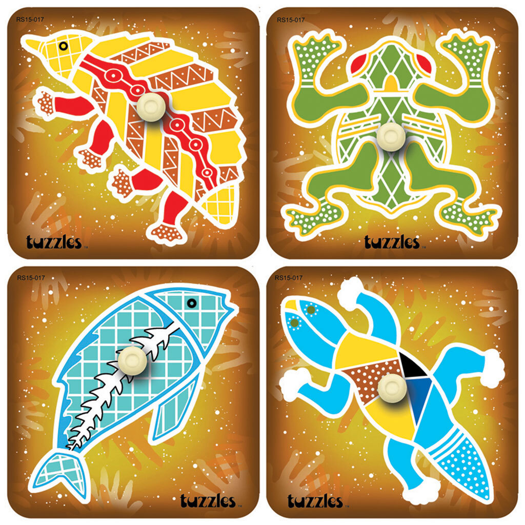 A set of four separate Peg puzzles featuring Aboriginal Art, the puzzles depict an Echidna, a Frog, a Fish and a Gecko. The puzzles are separated to allow the child to concentrate on just the one shape at a time and to manipulate that shape into position. This puzzle is also a great tool for learning about the Indigenous people of Australia. Perfectly cut pieces make learning easier.