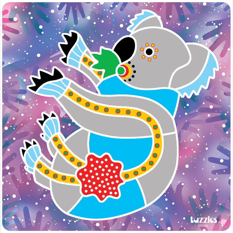 A Flat Tray wooden puzzle cut into the random shapes to make Aboriginal Art - Koala. This puzzle is a great next step after raised puzzles and it extends the child's fine motor and spacial awareness development. The random cut pieces help them understand the positive and negative space concept and the bright and colourful image encourages them to complete the picture.