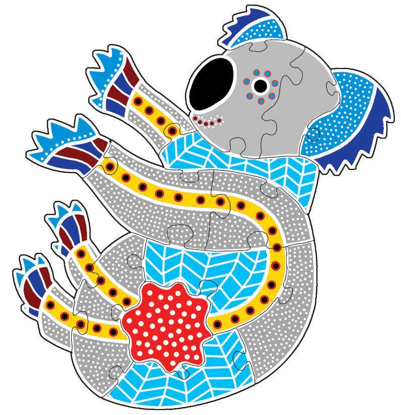 Tuzzles Aboriginal Art Koala wooden Floor Puzzle shows a Dreamtime depiction of a Koala, one of the unique Australian animals. Floor puzzles encourage children to participate, to develop their language skills and their sensory development skills. Floor puzzles make a great group activity.