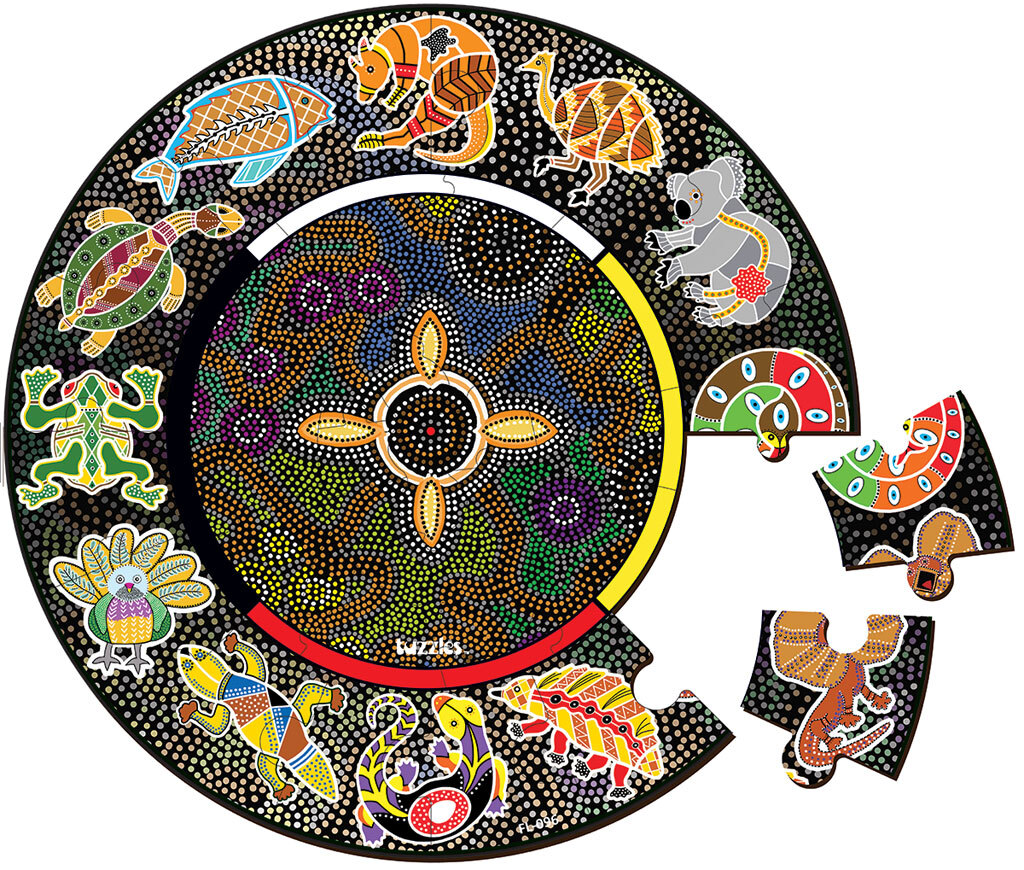 The Meeting Place is culturally sacred to the Aboriginal people of Australia, it depicts a place where they meet, sit in circles and talk. In this Tuzzles Aboriginal Art puzzle depicting ‘The Meeting Place’ children will learn about this significant symbolism, see the people sitting around the fireplace and be able to follow the tracks leading to the types of animals which were part of the staple diet of the Aboriginal people. Size 600x600mm 36 Pieces