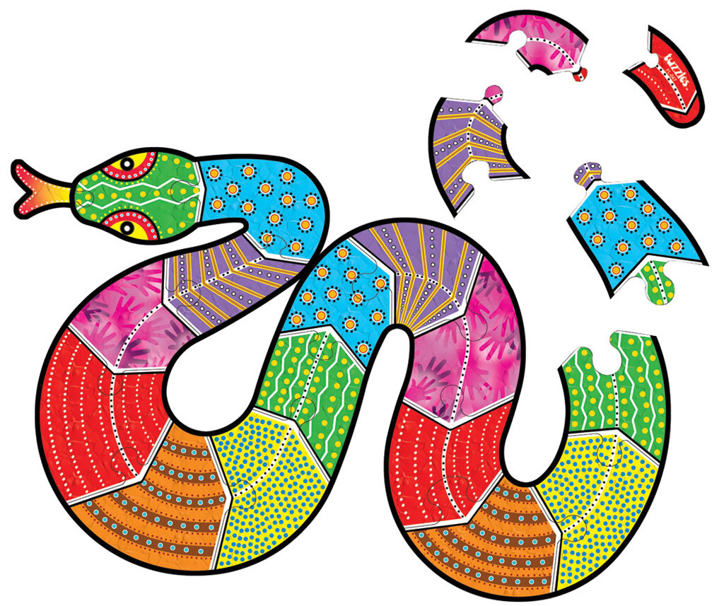 This beautiful Giant wooden Floor puzzle of an Aboriginal Art Rainbow Serpent makes a great group activity. The large chunky pieces help small hands to manipulate them into place and the bright colourful image encourages them to complete the task. This is a delightful and interesting puzzle.
