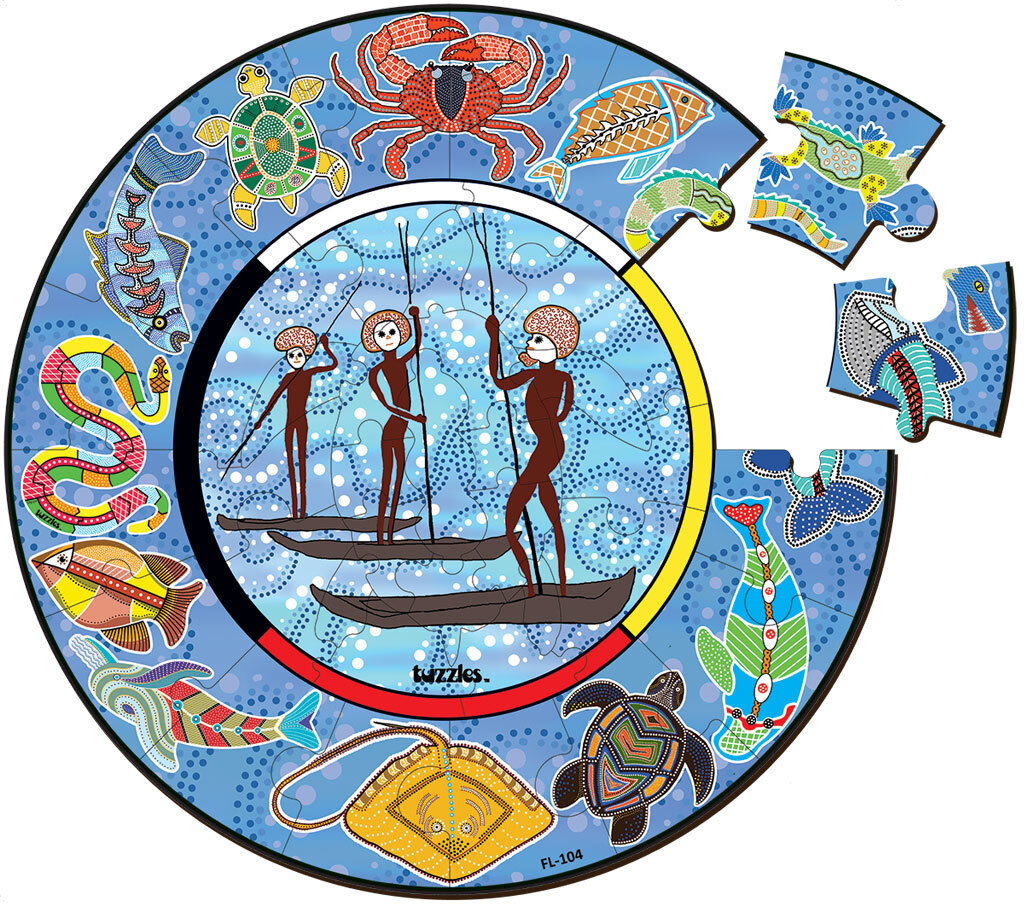The Aboriginal people of Australia were great hunters both on the land and in our oceans. In Tuzzles Aboriginal Art Sea Story wooden puzzle children will see the fishermen standing in their dugout canoes and in the circle around them, the types of animals they hunted. Size 600x600mm 36 Pieces.