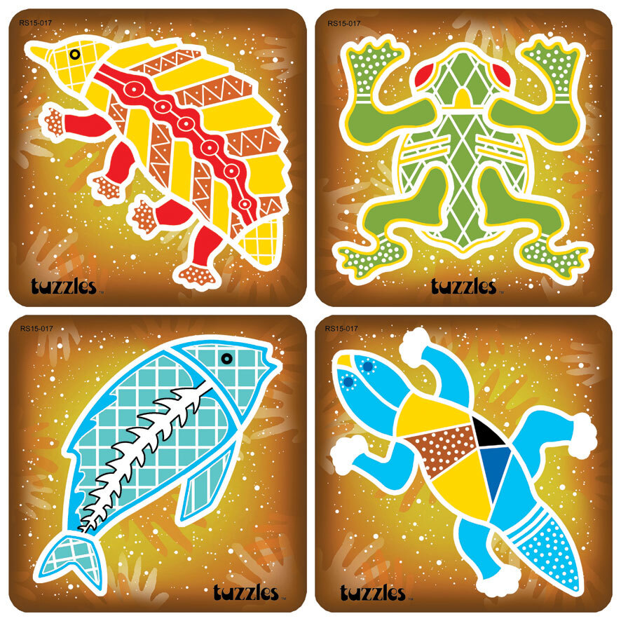 Each of the 4 raised puzzles in this set of 4 puzzles is a challenge in itself. The pieces have been raised above the background for ease of manipulation. Aboriginal Art Set 1 features an Echidna, a Frog, a Fish and a Gecko.