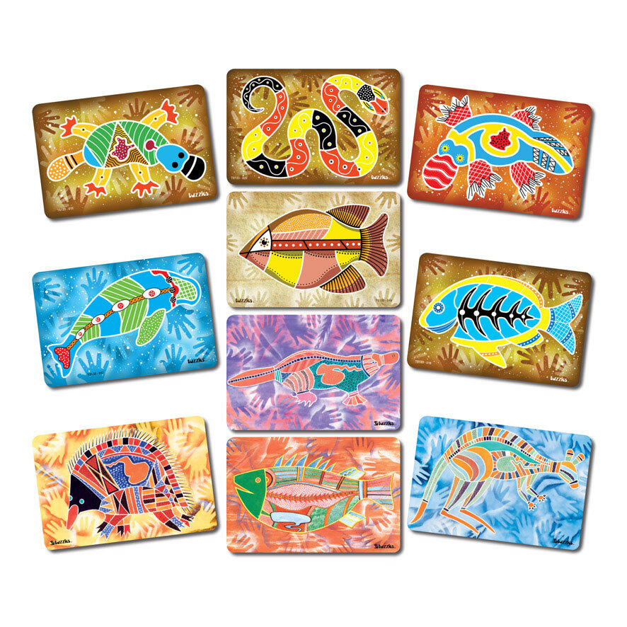Set of 10 Aboriginal Art Flat Tray 133 x 200 puzzles. This set of puzzles displays many different animals. This is a great set of puzzles for the classroom.
