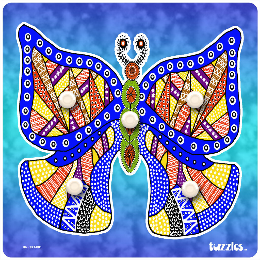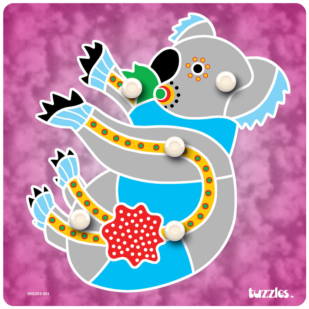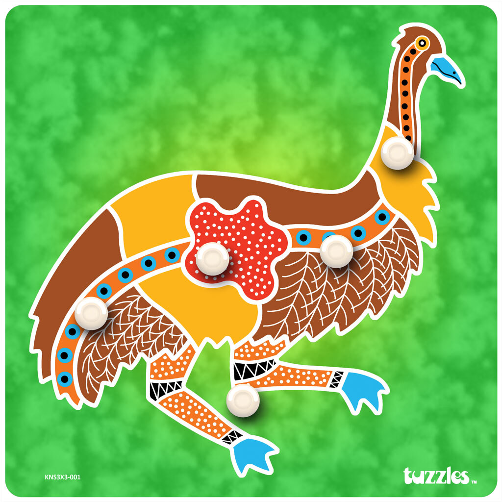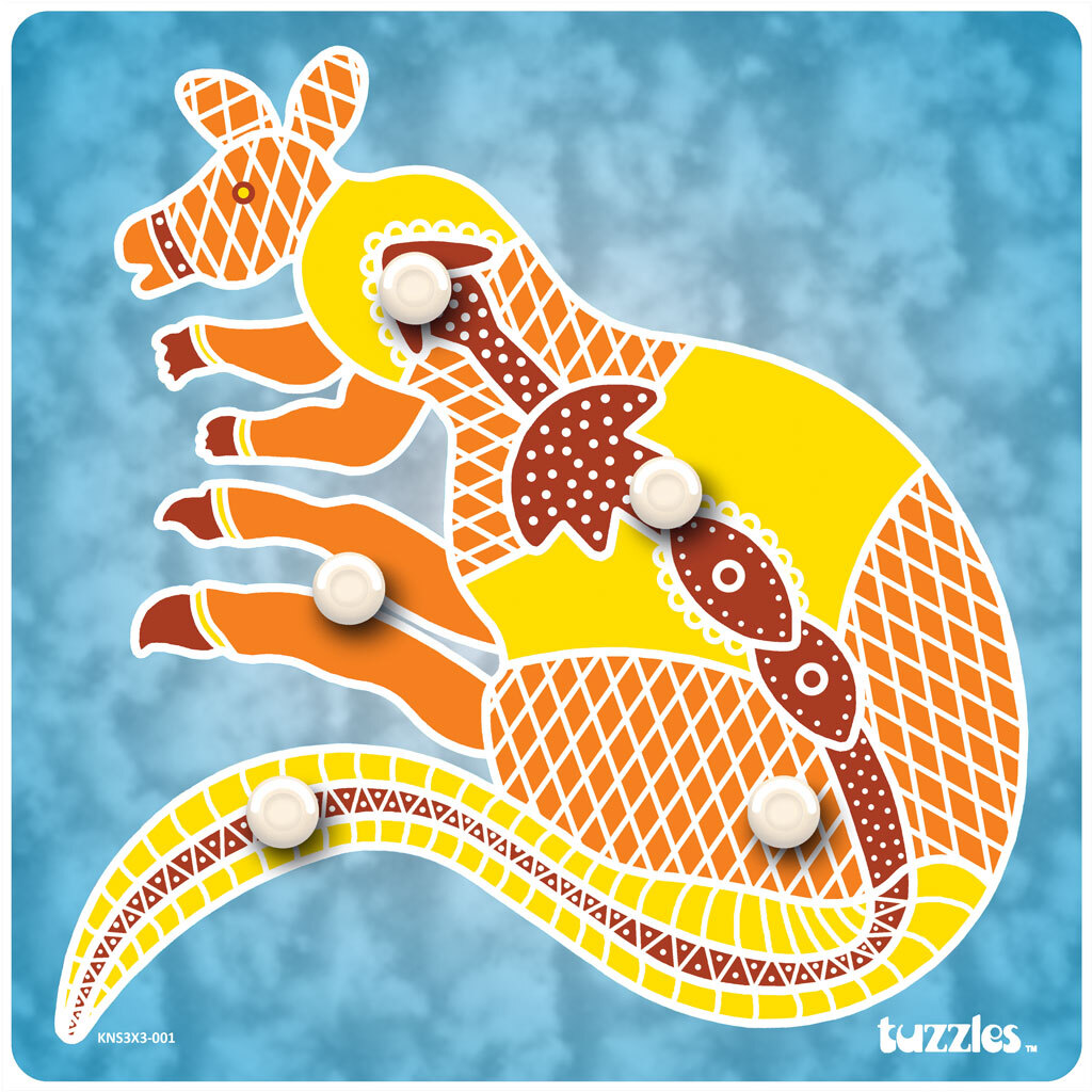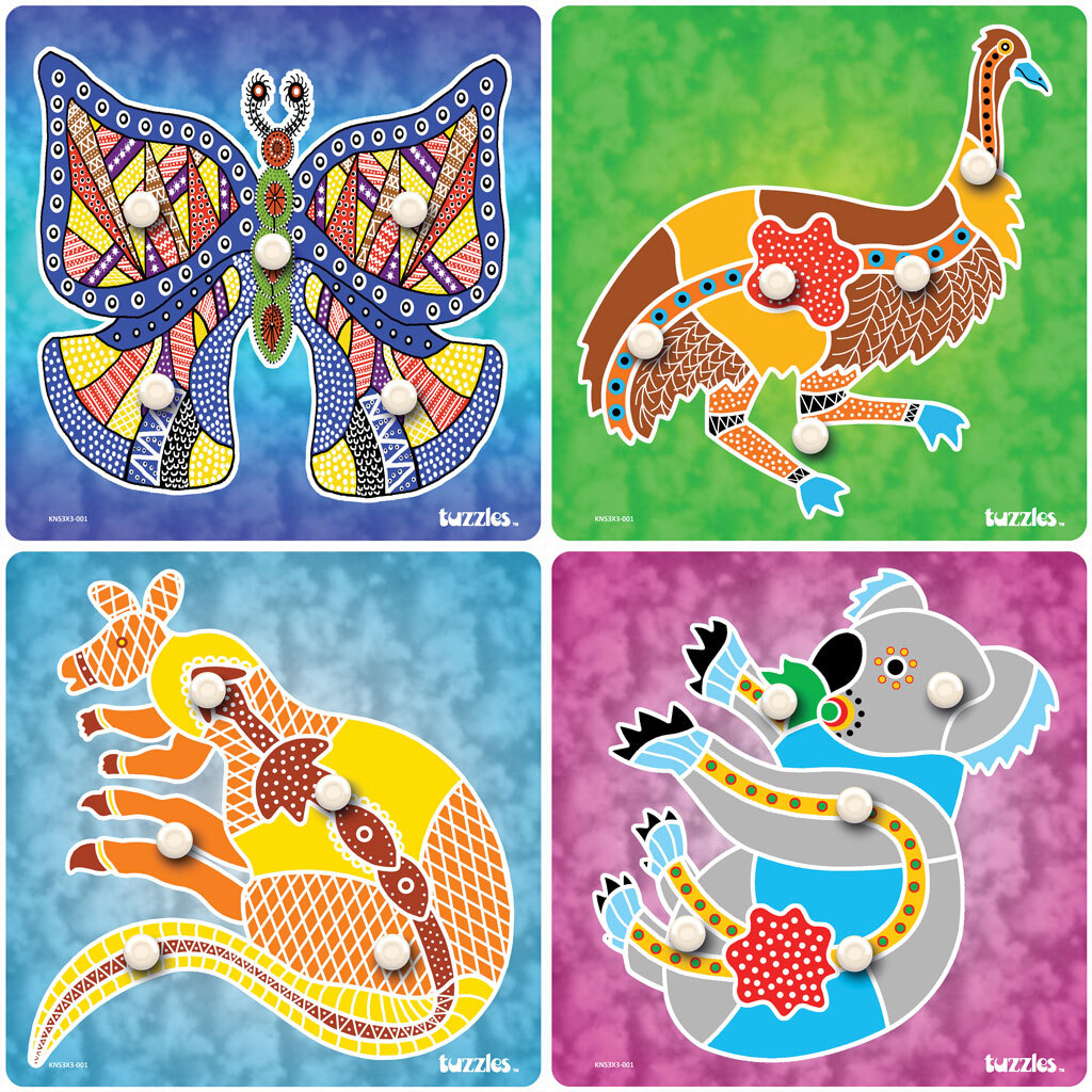 Tuzzles Aboriginal Art Set of 4 Easy Grip Peg Puzzles Size each 300x300mm Pieces 5 each puzzle. Suitable 18 months+ The easy grip pegs allow small hands to manipulate the pieces in these Whole Picture Peg Puzzles. The Aboriginal Designs of the Dreamtime Animals help children to learn about Australian Cultural Heritage. The whole pictures encourage space and shape recognition and are the next step after one piece or individual piece peg puzzles.