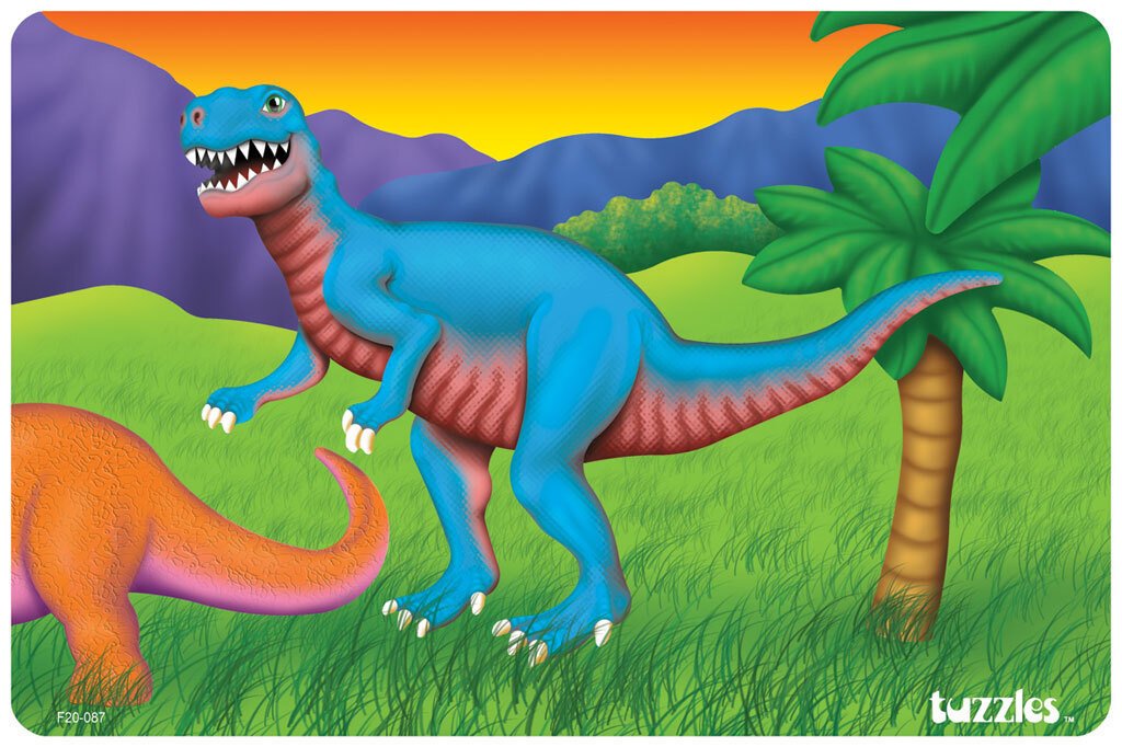 The Allosaurus lived during the Jurassic Period 208-144 million years ago. This tray puzzle depicts the dinosaur in what could have been his natural environment. Dinosaurs are a very popular topic of conversation. children are fascinated by them which encourages active participation in achieving their goal of completing the puzzle. Shape cut pieces are an excellent way of improving shape recognition skills as the student has to discover both the positive and negative shape to complete the picture.