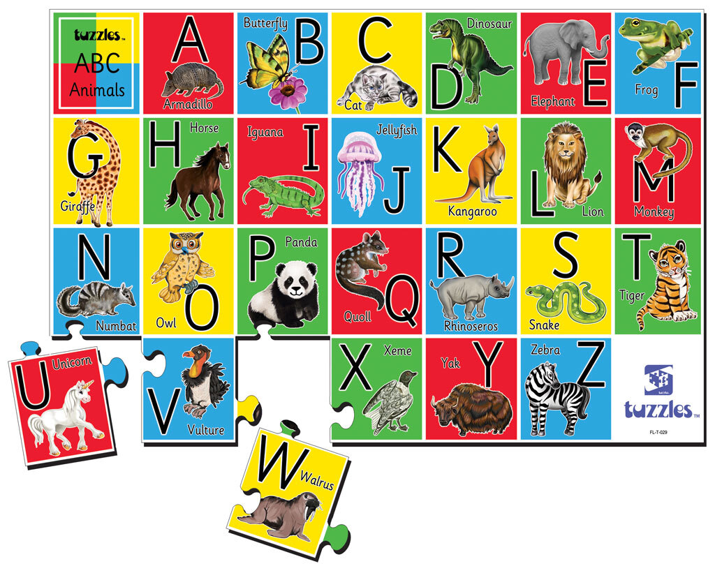 This big, bright Alphabet puzzle will help young children to recognise letters and articulate their sounds, by identifying and learning the names of the cute animals illustrated on each piece. The puzzle is ideally large enough for two students to work together on the floor, yet small enough for an individual to complete at a table. This puzzle is called Alphabet Animals Table Puzzle.