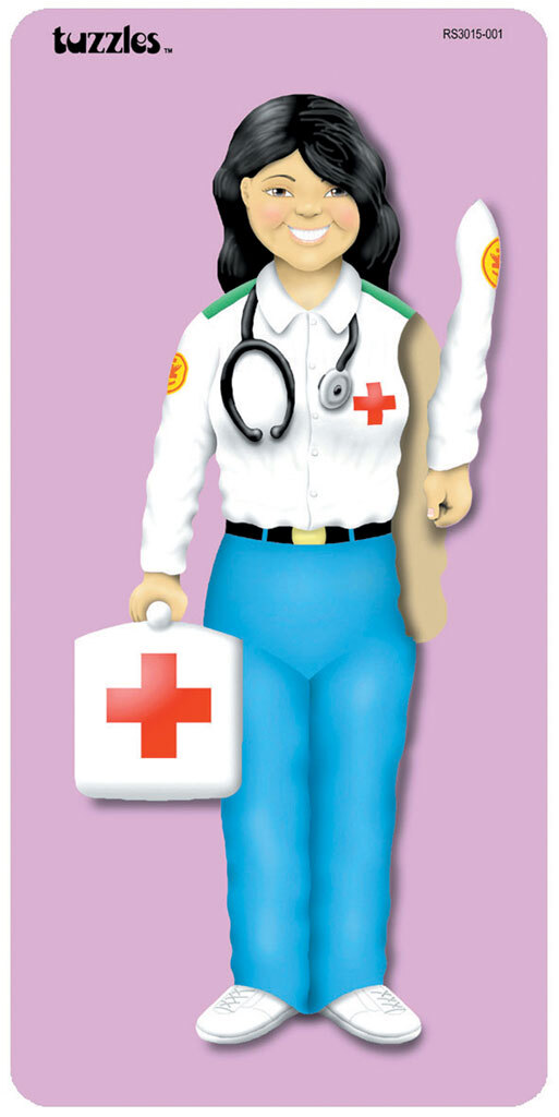 A raised shape wooden puzzle of an Ambulance Officer. This is part of Tuzzles people who help us series of products. This is a great first puzzle after Peg puzzles.