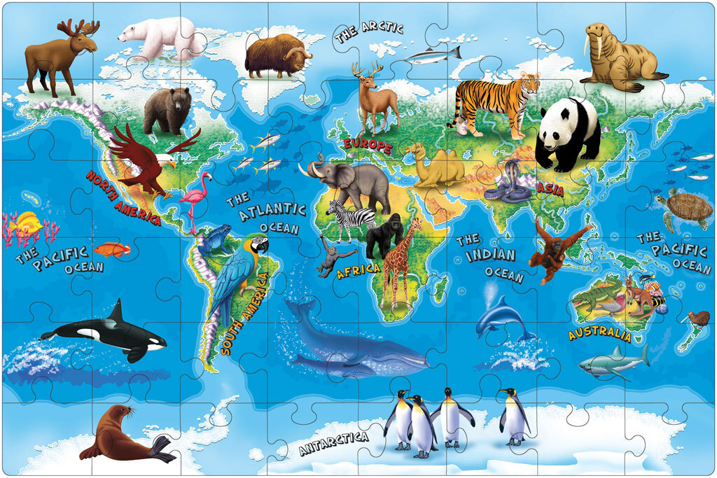An enormous Tuzzles wooden floor puzzle featuring endangered species from across the globe. Perfect for discussing habitats, endangered species, continents and maps. Floor puzzles promote communication and cooperation. Sturdy Tuzzles quality pieces mean that this puzzle will last. Recommended for ages 3 and up.