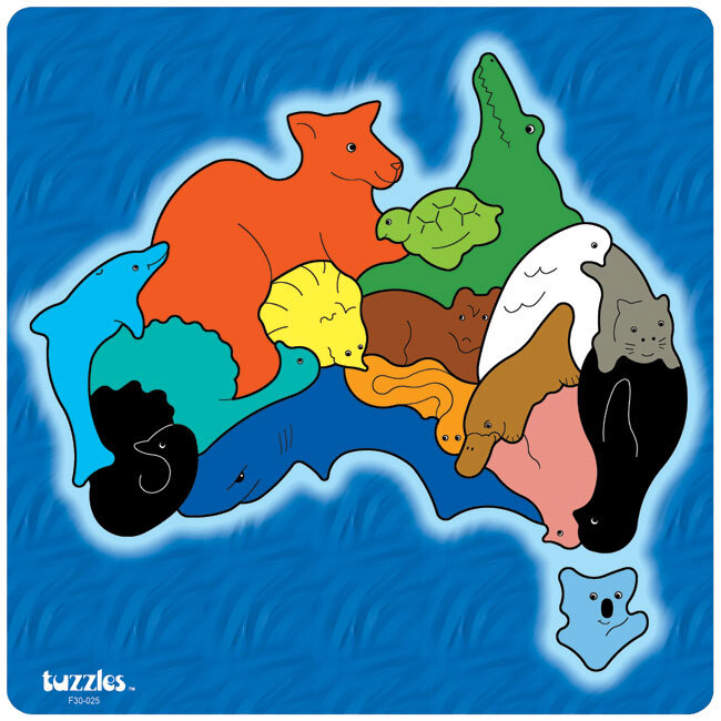 A mosaic consisting of well known Australian animals. The Crocodile at Cape York, the Great White Shark in the Great Australian Bite, the Dolphins at Monkey Mia in Western Australia. Children learn a lot of interesting information whilst they practice their puzzle skills. This Flat Tray wooden puzzle is called Australian Animal Mosaic.