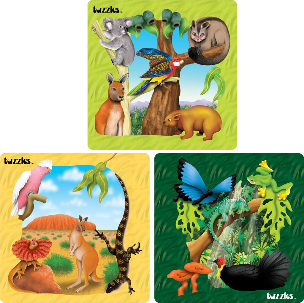 A set of three Flat Tray wooden puzzles showing the different environments that exist in Australia. The Rainforest, the Bushlands and the Dry Interior.