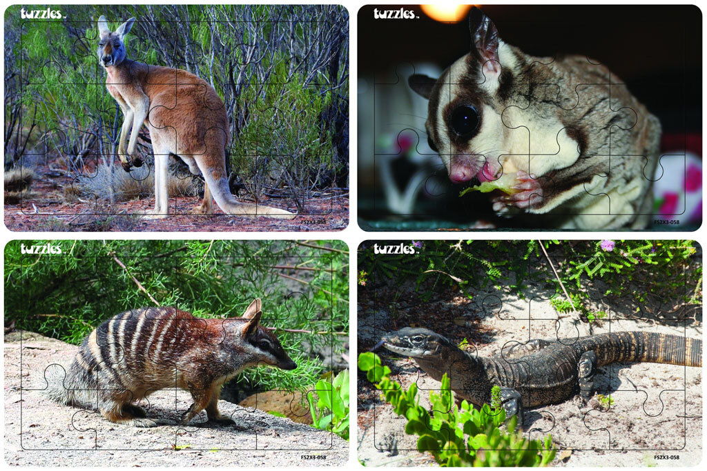 A set of Flat Tray wooden Photographic puzzles featuring Australian Animals, a Lace Monitor, Kangaroo, Numbat and a Possum.