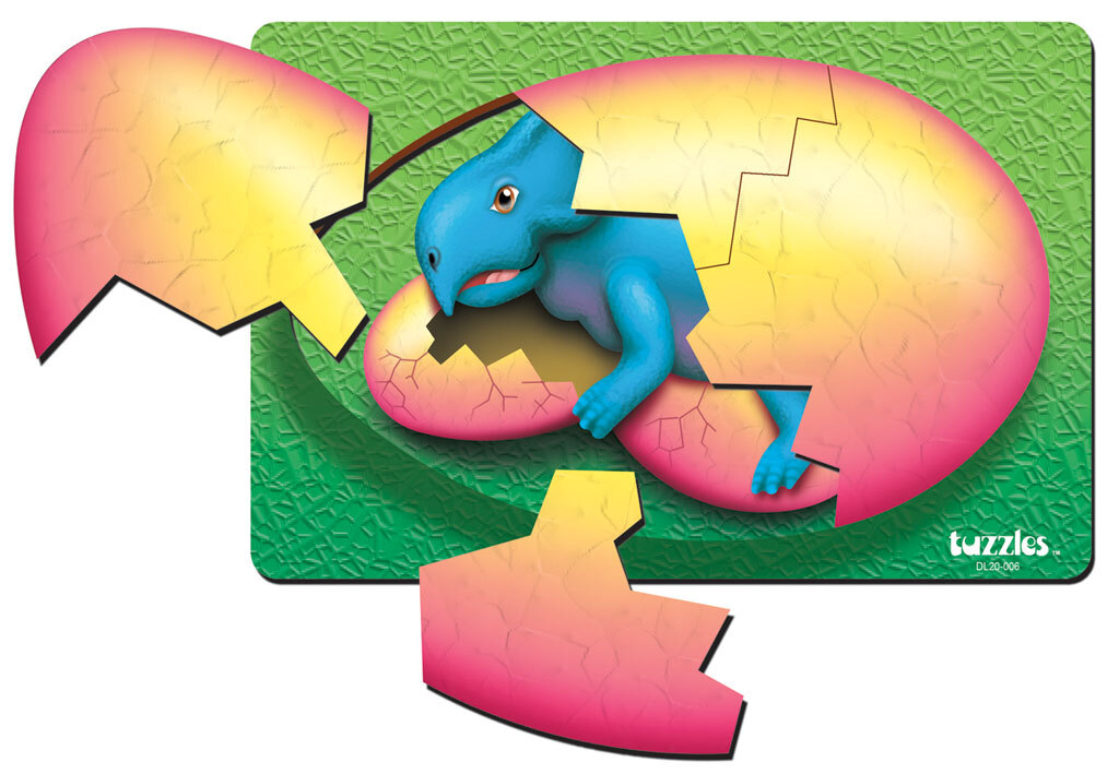 A 2- Layer Flat Tray Puzzle 2-layer depicting a baby Protoceratops dinosaur emerging from it's egg. Called discovery puzzles children will delight in discovering the dinosaur hidden underneath.
