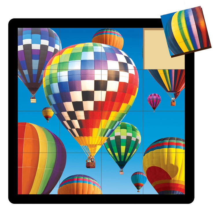 Which way is up? The colourful Balloons are set into a plain black square frame and each of the pieces is cut into a perfect square making this challenge about orientation and colour. This is a Flat Tray wooden puzzle in 16 pieces but is also available in 36 and 64 pieces which are an even great challenge.