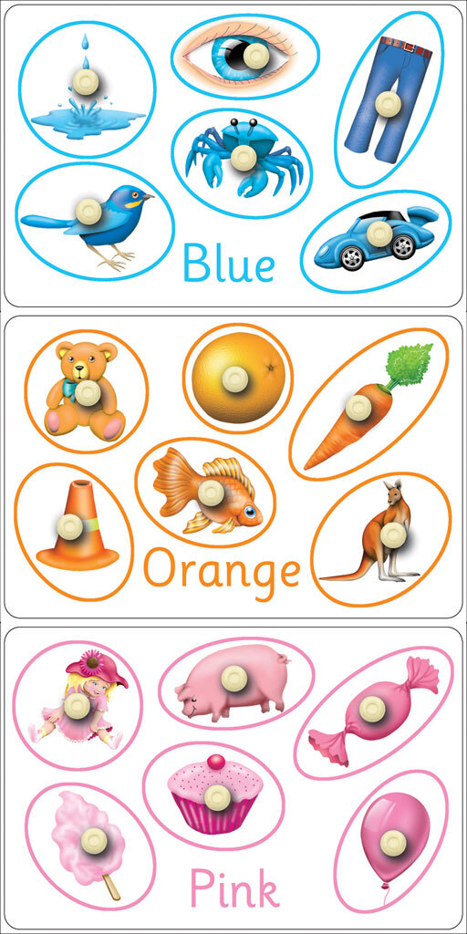 A set of three wooden puzzle focusing on the colours of Blue, Orange and Purple. Match the coloured objects with the coloured ring surrounding the objects. These single piece peg puzzles have easy grip pegs, excellent for small fingers and the pieces .
