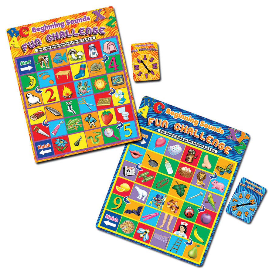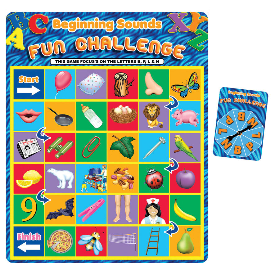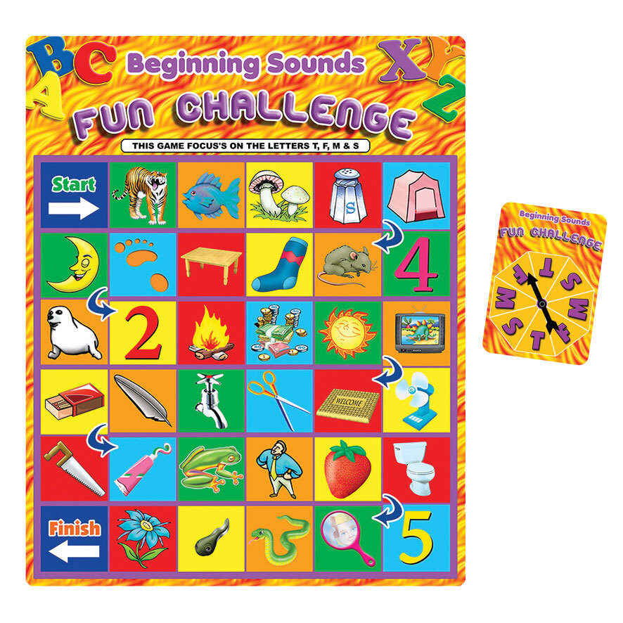 Each Player in turn spins the spinner. The Player moves their token to the first picture which corresponds with the letter spun on the spinner. E.g. If the spinner lands on [t] then the Player moves to the first picture which makes the beginning [t] sound. Each activity game board comes with a full set of instructions.