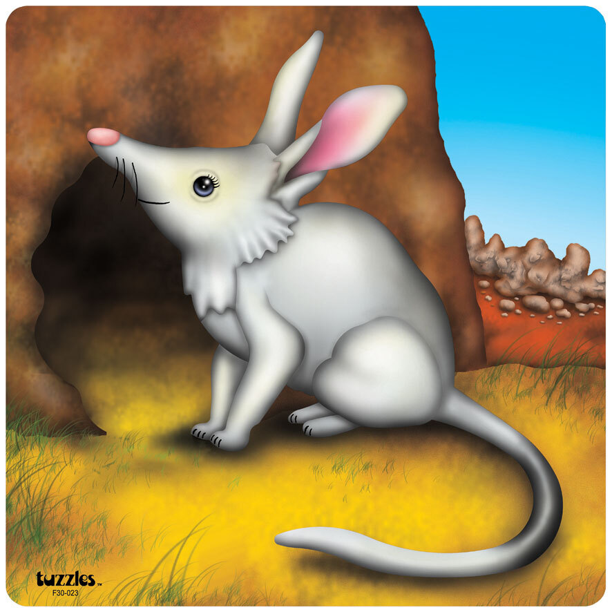 A Flat Tray wooden puzzle featuring the Australian Bilby. This animal is much loved by children and is part of the endangered species range of products. The puzzle is shape cut to make it a good challenge and this puzzle is a great next step to raised puzzles.