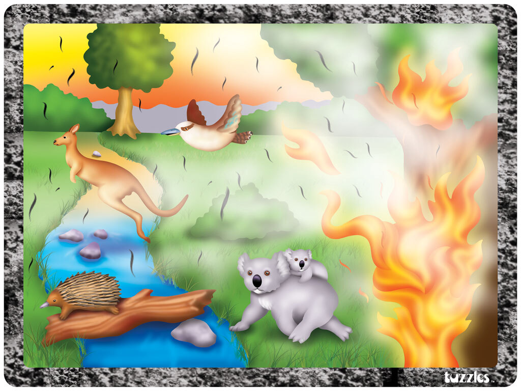 All to often our precious bushland animals have to flee for their lives. This puzzle shows the animals escaping as the relentless fire pursues them. This helps students to understand the dangers of fire and the very real consequences. With bright colours and interesting shapes it is an excellent teaching tool. Bush Fire Escape is a Flat tray wooden puzzle with shape cut jigsaw pieces. This puzzle is also a challenge.