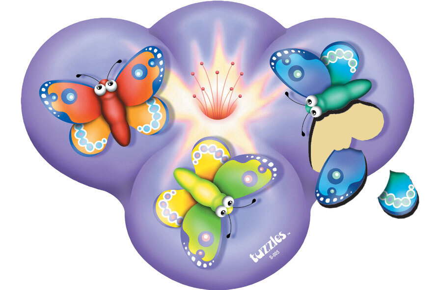 The pretty butterflys on the flower have all been raised above the background. The butterflys are all interchangeable and the children can learn to match or mix up the colours of their wings. This puzzle is one of the harder ones in the shape puzzle range.