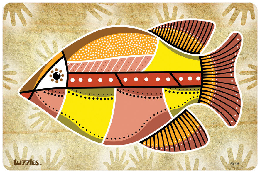 Part of the Tuzzles Aboriginal Art series this representation of a Cave Fish painting Flat Tray wooden puzzle is a great way for children to practice their early learning skills. The puzzle is shape piece cut so that it is a great way for children to learn about positive and negative shapes and this also makes this puzzle a bit of a challenge. A great step up from our Raised puzzles.