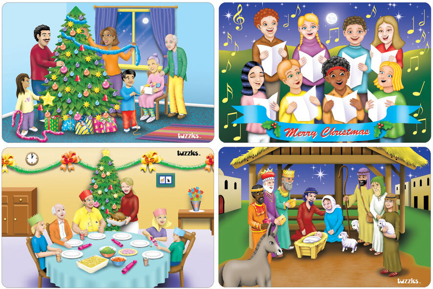 A set of 4 Flat Tray wooden puzzles called Christmas Activities. Includes Nativity Scene, Carol Singers, Christmas Dinner, Decorating the Tree. These puzzles have been cut into 12 pieces.