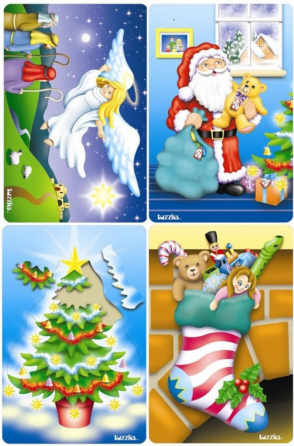 This is a set of 4 Flat Tray traditionally cut puzzles called Christmas Icons which includes Santa, Christmas Tree, Angel, Stocking.