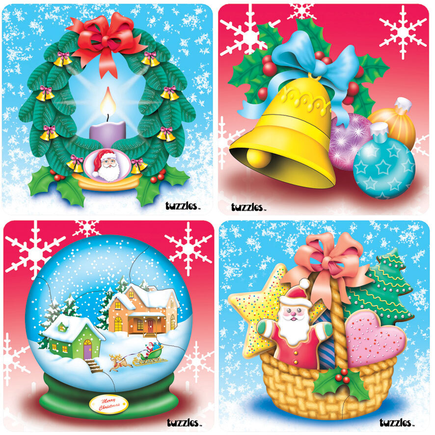 Includes Wreath, Bells, Cookie Basket, Snow Globe This Set of 4 Raised Pieces puzzles called Spirit of Xmas a great for group activities. The different images and differently shaped pieces makes this an exciting challenge.
