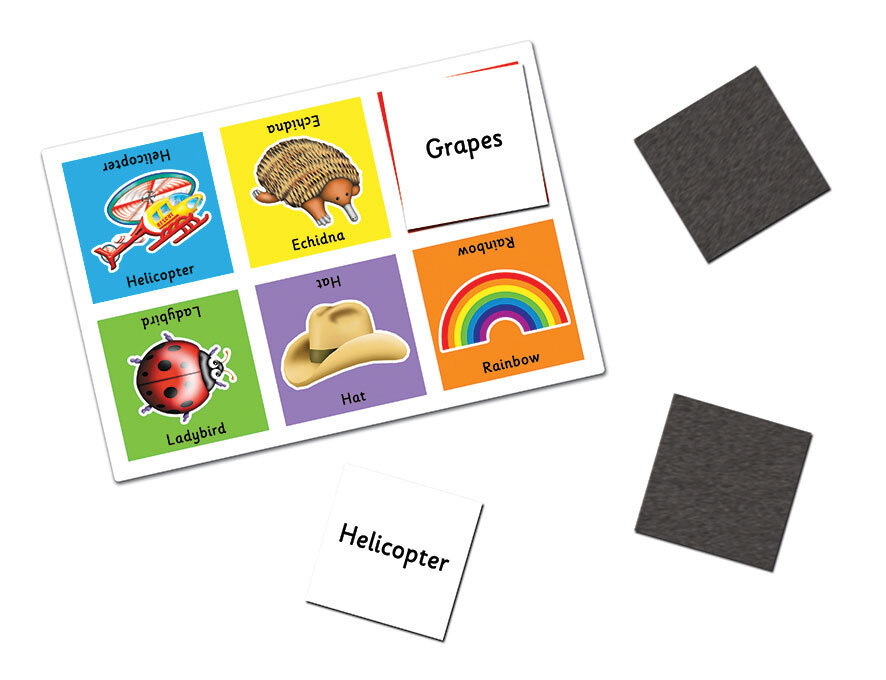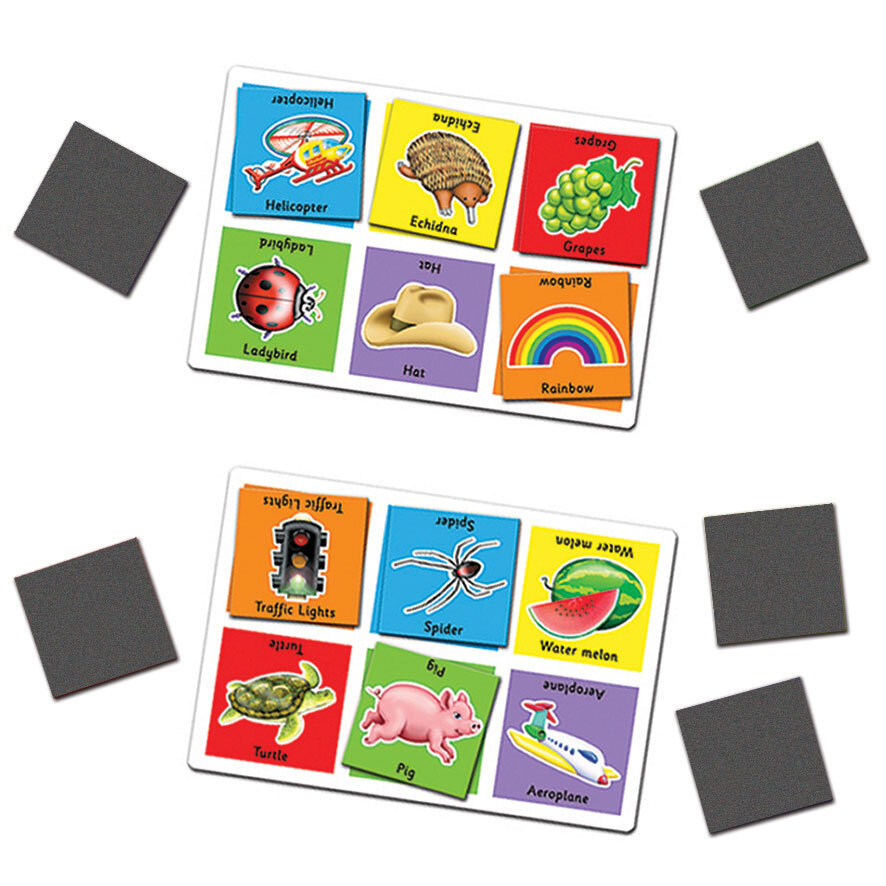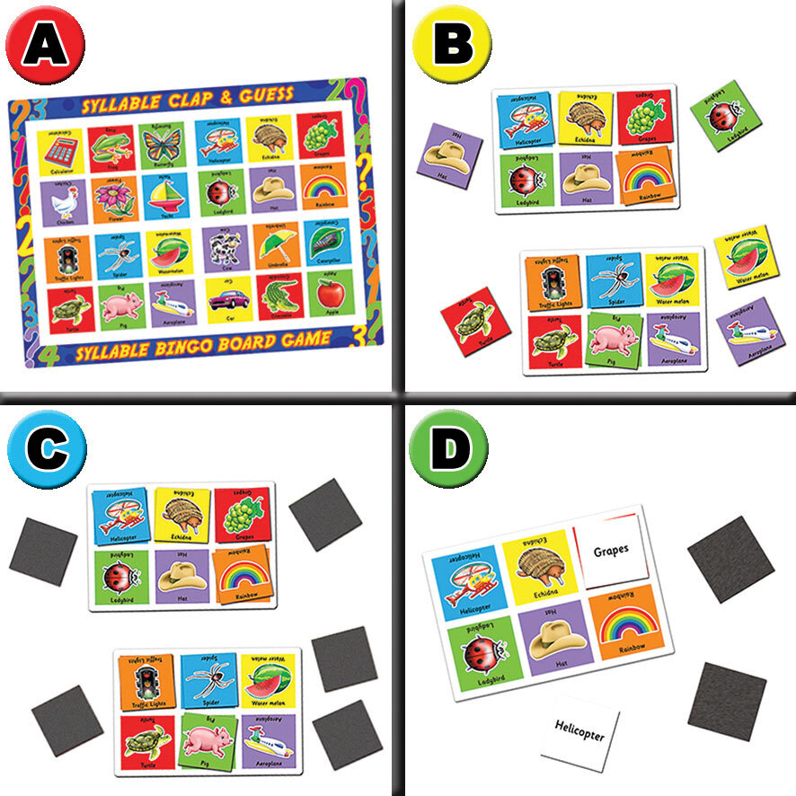 3 Games in 1. CLAP AND GUESS / BINGO / MEMORY LOTTO. Distribute the matching Game board tiles evenly to the players. Each player in turn decides which picture they are going to make others guess and they clap out the syllables in the picture word shown. 2 to 4 players and one caller. Encourage Children to take turns at being the caller. Each player takes one of the four separate game boards and the matching picture tiles. The Game board and the tiles are placed face up in front of each player. Extra game for Teachers. Use the individual boards and matching tiles to play Memory Lotto. Encouraging the children to read the tiles and expand their memory and attention to detail.
