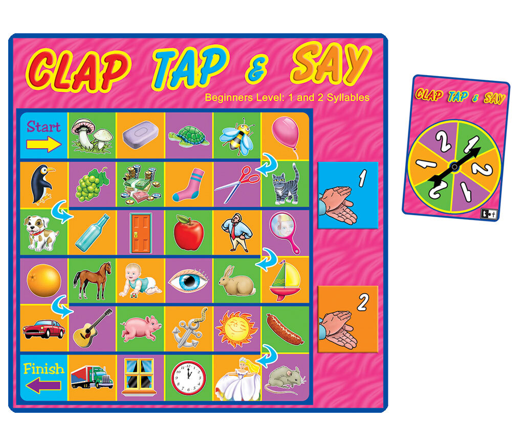 Game Board with pictures depicting 1 and 2 syllable words. Different coloured tokens and a Spinner with 3 colours and the numerals 1 and 2 repeated. All the instructions come with each game.