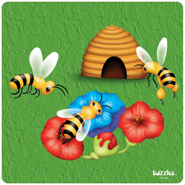 A Flat Tray wooden puzzle depicting worker Bees gathering nectar to take back to the Hive. Called Collecting the Nectar this puzzle is a great way to show children how Bees collect the nectar to make honey and the shaped pieces add the extra learning skill of positive and negative shape. This puzzle is a perfect next step after Raised puzzles.