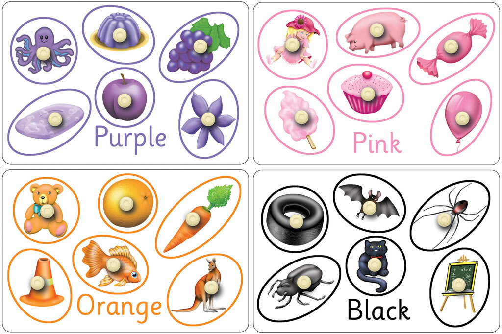 A set of 4 single piece peg puzzles featuring the colours of purple, pink, black and orange. Easy grip pegs make piece manipulation easier and the coloured rings around the pieces help with the early learning process of colour recognition.