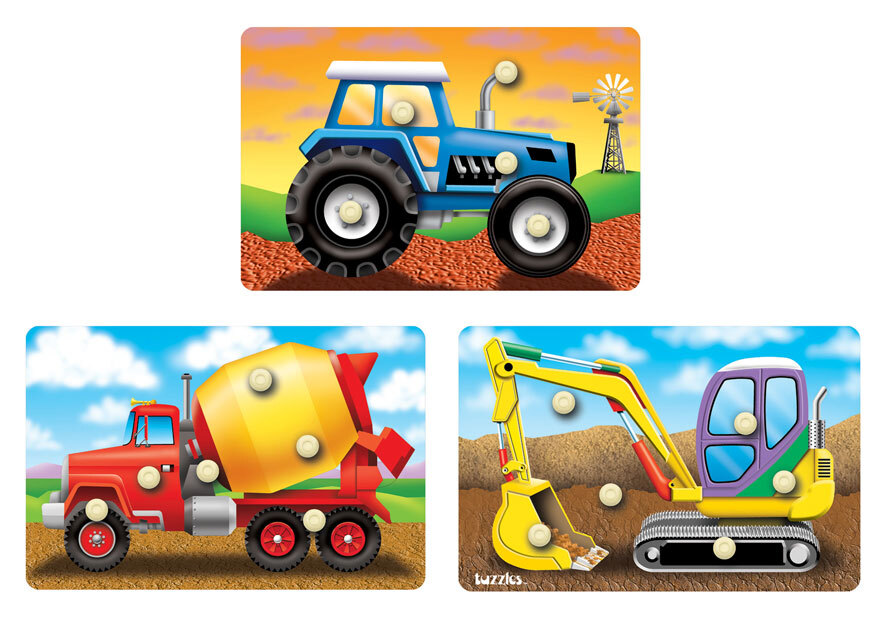 A set of three puzzles featuring a Tractor, a Cement Mixer and an Excavator. Each puzzle is a whole picture peg puzzle which is the next step from single peg puzzles. Part of the Tuzzles Transport theme, these puzzles are made of wood and use easy grip pegs to help facilitate easy manipulation of pieces..