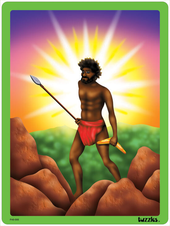 A Flat Tray wooden puzzle depicting one of the First Australians. Dawn of Time is a shape cut puzzle which means that it is more of a challenge than a traditional cut jigsaw puzzle. The shape pieces help children learn spacial awareness as they have to first find the negative space and then match it with the positive shaped piece. All the pieces come out leaving just a narrow border and the tray gives the student a space to work within. But remember to "Gently Tip and Turn" the pieces out of the frame. Please read the care instructions on the sticker on the back of all Tuzzles tray products.