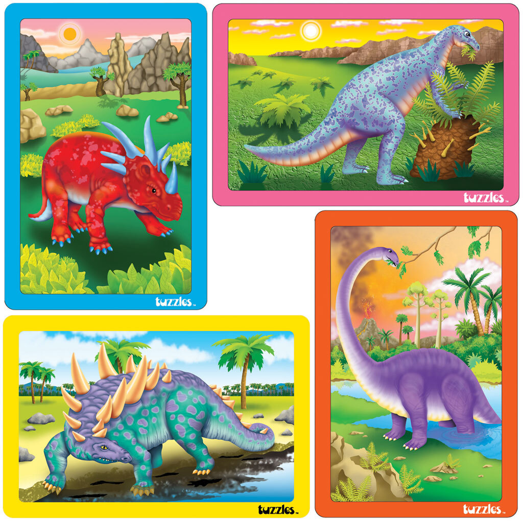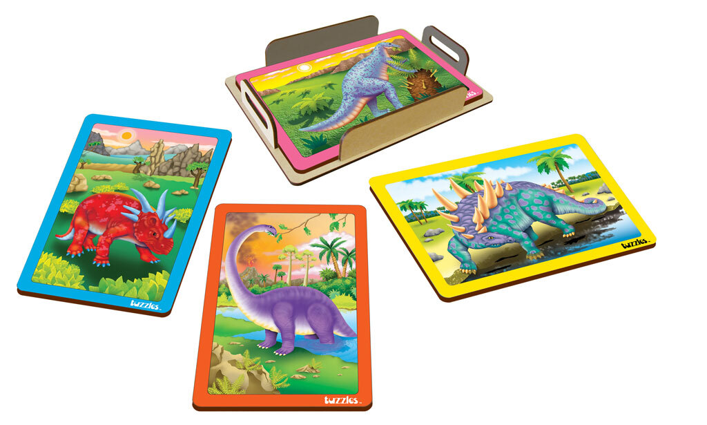 Four Flat Tray wooden puzzles showing different types of Dinosaurs . These puzzles are shape cut so that they present a harder challenge than traditionally cut pieces. The bright and colourful imagery encourage active participation in the activity.