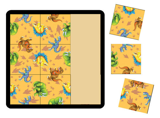A Grid cut Move and Match Game featuring Dinosaurs. The pieces are cut into perfect squares and will fit into the frame in any direction and any location so that student has to work out the correct orientation and placement of each piece to complete the game.