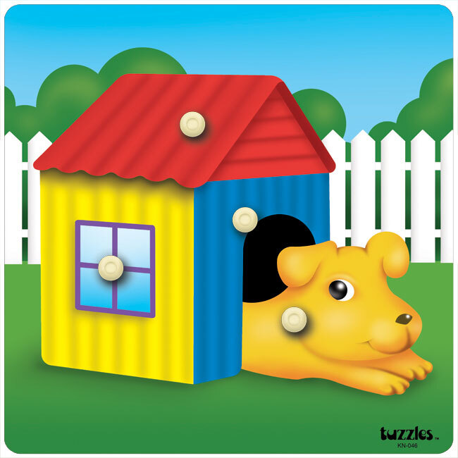 This Whole Picture Peg Puzzle shows a cute dog sitting in his kennel. The picture has four distinctly different pieces and the different shapes showing the roof, walls and of course the dog help the children to understand shape and form whilst they are practicing their fine motor skills.