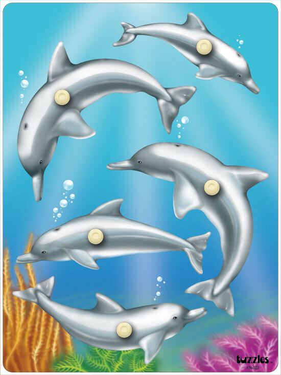 This Peg puzzle of Dolphins swimming has a bright colourful picture with Dolphins going in all directions. The Dolphins are of different shapes and sizes which helps the child to locate the pieces into their correct location.