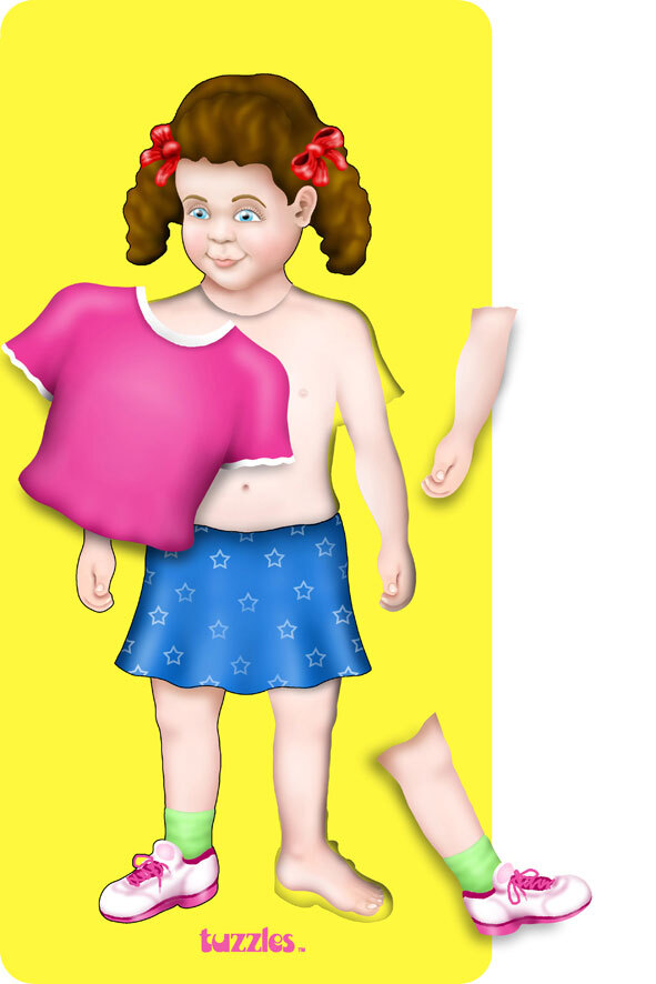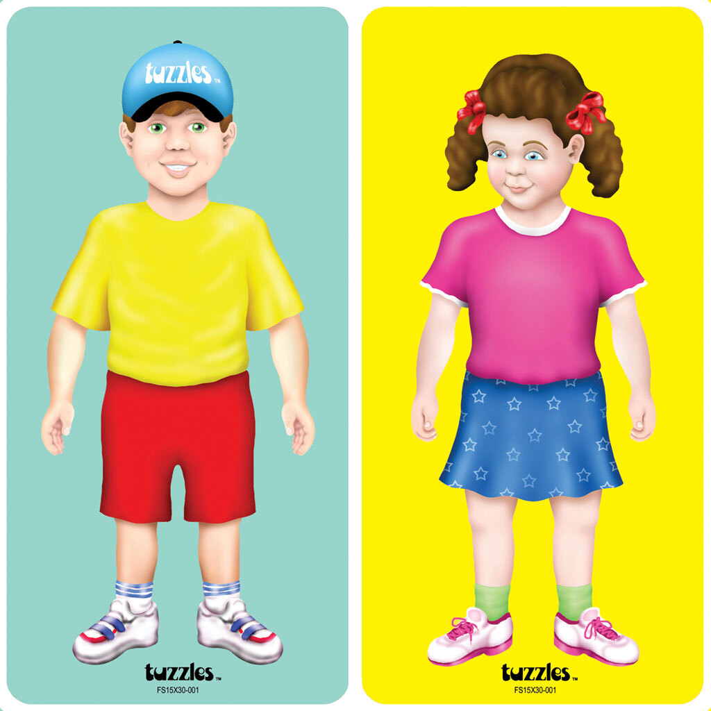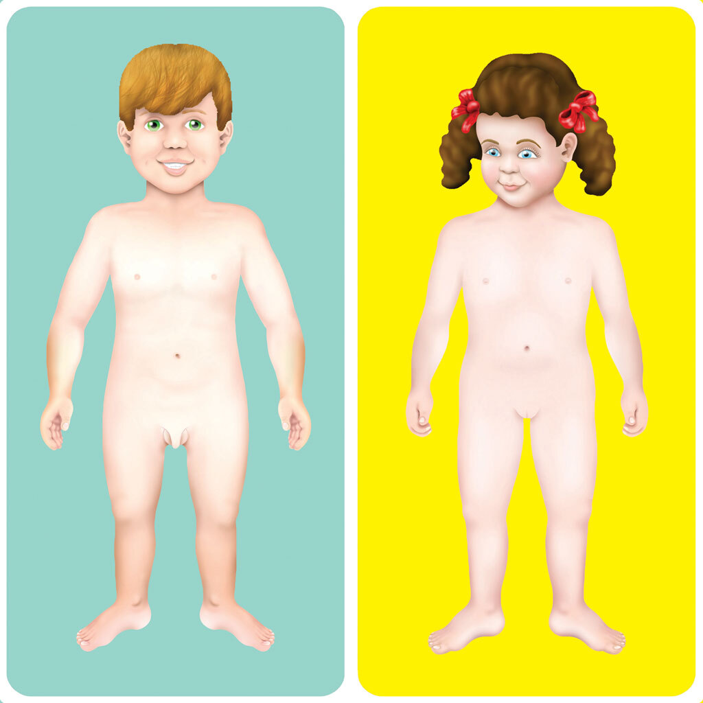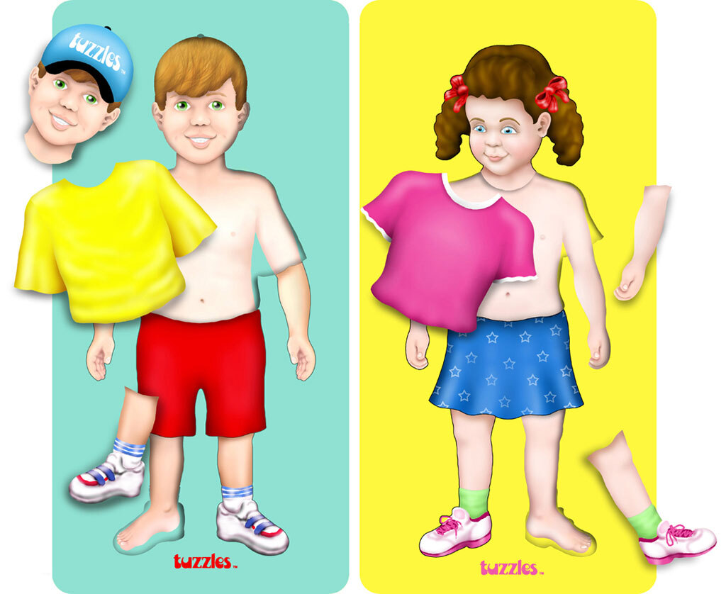 A set of 2 wooden puzzles depicting a fully clothed boy and girl. Beneath the pieces of clothing is the same boy and the same girl with no clothing.