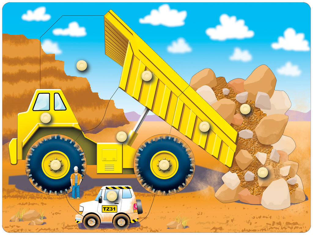 This Whole Picture Peg Puzzle is made of wood with a bright and colourful image of a Dump Truck dumping soil. The Pegs are easy grip and perfect for small fingers and the theme of this puzzle is Transport.