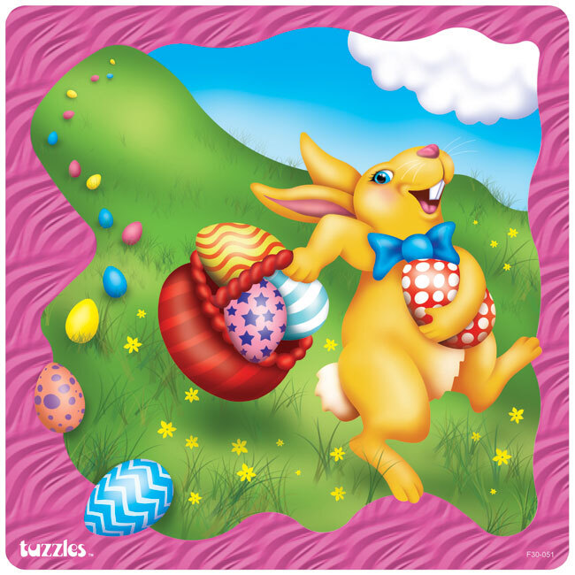 How many children love to go on an Easter Egg Hunt. In this Flat Tray wooden puzzle called Easter Egg Hunt the rabbit is scattering the eggs all around. The shaped frame helps children who are learning about spacial awareness as they get some "clues" about the placement of the frame edge pieces.