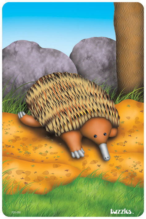 The Echida Flat Tray wooden puzzle shows another unique Australian animal. The shape cut pieces make the puzzle an interesting challenge and the bright and colourful image encourages active participation in this activity.