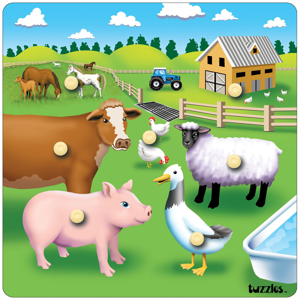 A colourful 7 piece peg puzzle depicting a typical farm scene. This whole picture peg puzzle, meaning all the pieces are connected, is the next step up from single separate piece peg puzzles. The image is bright and interesting and each distinct shape helps the child to complete the task successfully whilst learning about near and far objects in perspective.