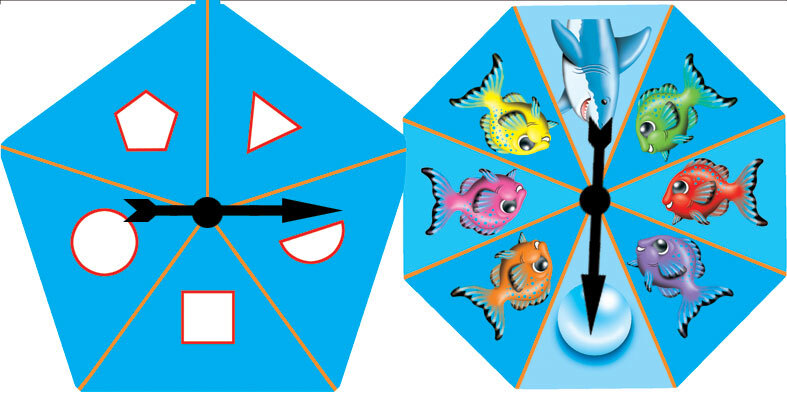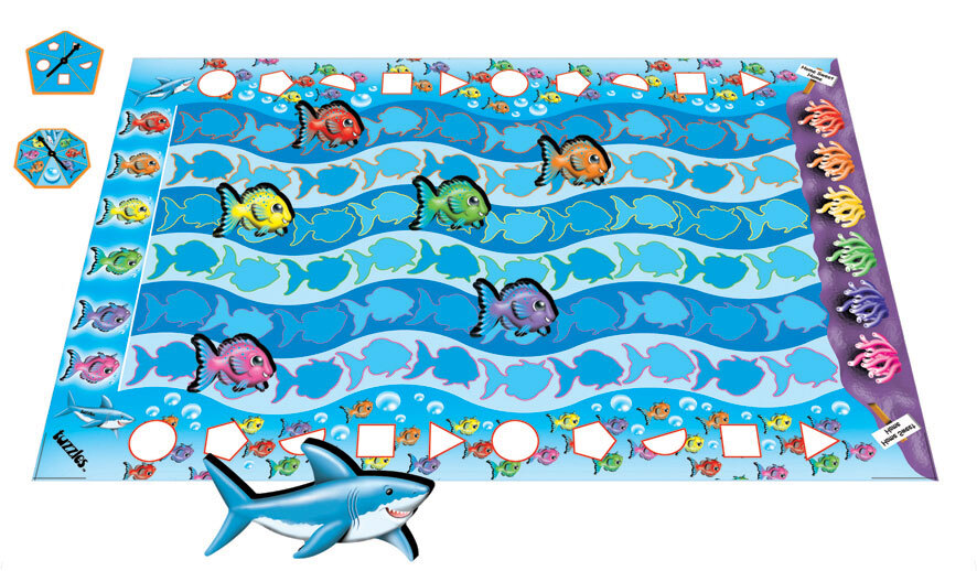 A Fun board Game that teaches colour recognition and turn taking.Spin the spinner and the coloured fish move down the board towards the coral. When the fish stops, spin the shape spinner and if the shape spun matches the fishes location the hungry shark chases the fish back to the start. This game also teaches consequences and envolves lots of interactive communication and group discussions.