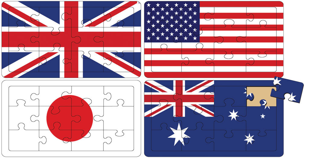 A set of four puzzles in traditional cut featuring the Union Jack, Australian flag, Japanese flag and the US flag. Learn about countries and their flags, discuss similarities and differences. Featuring full-color images and Tuzzles famous quality, this puzzle encourages hand-eye, fine motor and visual perception skills and essential pre-reading skills such as shape and colour recognition. This puzzle is recommended for ages 3 and up.