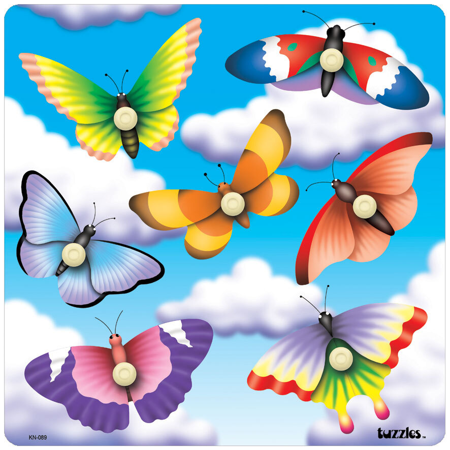 A bright and colourful quality wooden peg puzzle has seven different pieces. The Butterflies are different shapes and sizes and flying in different directions. This encourages shape recognition, and helps with all early learning requirements to help with early childhood development.