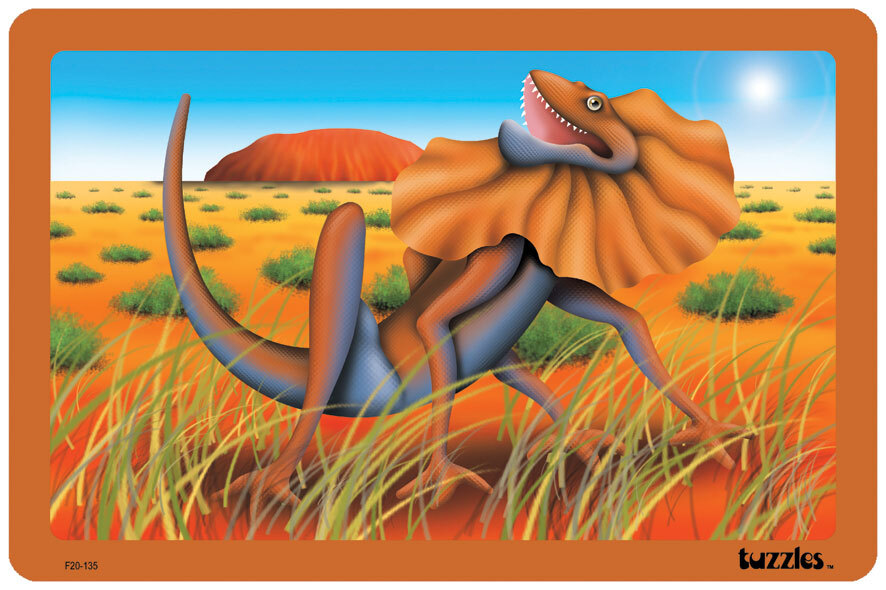 The Frilled Neck Lizard in the Australian Outback is the feature of this Flat Tray wooden puzzle. Definitely a challenge with it's shape cut pieces , this puzzle is part of the Animals and their Habitats Range of puzzles. Shape cut pieces are a greater challenge than traditional cut puzzle pieces.