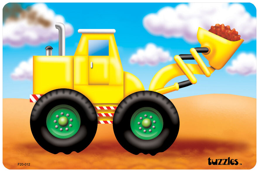 Flat Tray Puzzle depicting a Front End Loader, part of the Tuzzles Construction Vehicle range. A great puzzle to follow on after Pegs and Raised Tray puzzles as this puzzle will continue to help develop fine motor and shape recognition skills.