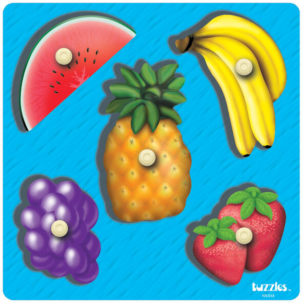 An early years wooden peg puzzle showing 5 different fruit types. Easy to manipulate pieces, easy to distinguish shapes and brightly coloured almost edible fruit pictures makes this a great puzzle for the younger child.